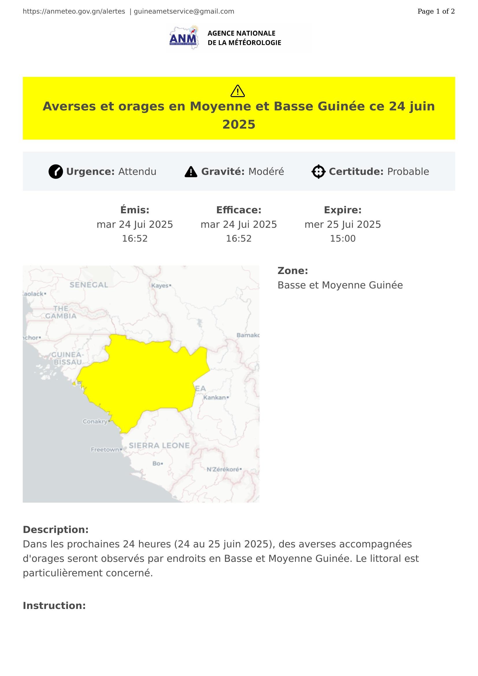 Dans les prochaines 24 heures (24 au 25 juin 2025), des averses accompagnées d'orages seront observés par endroits en Basse et Moyenne Guinée. Le littoral est particulièrement concerné.