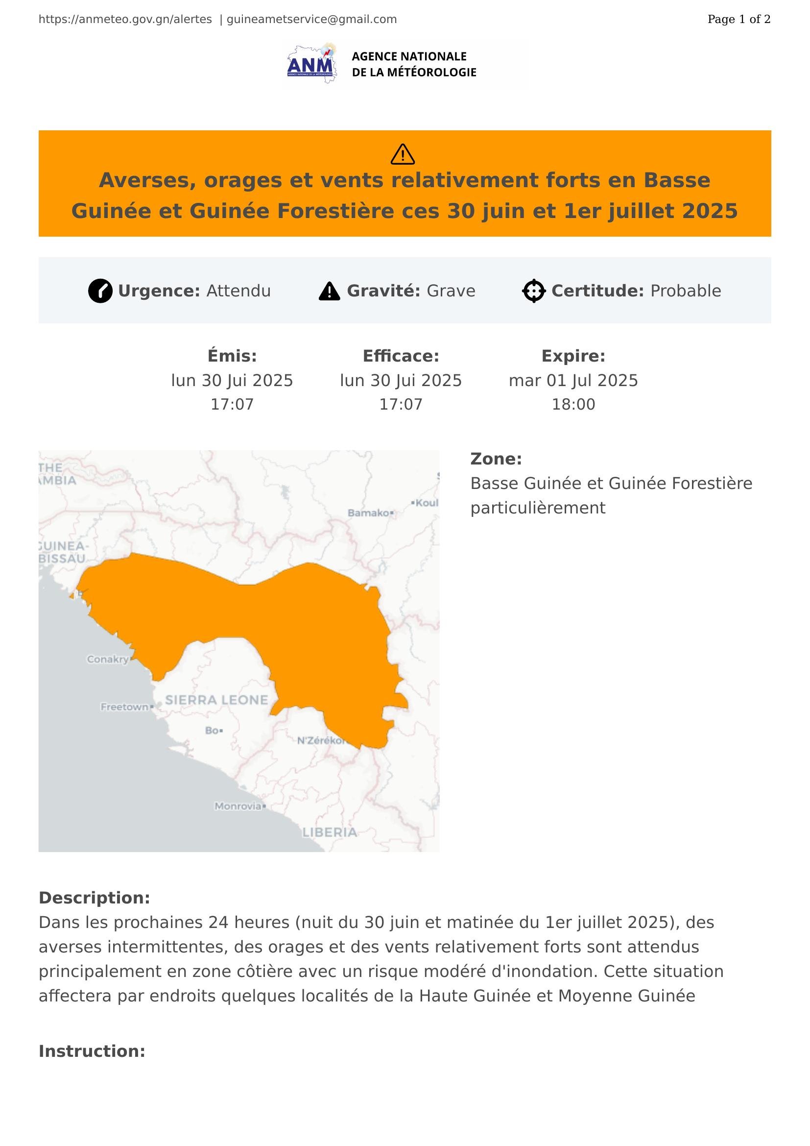 Dans les prochaines 24 heures (nuit du 30 juin et matinée du 1er juillet 2025), des averses intermittentes, des orages et des vents relativement forts sont attendus principalement en zone côtière avec un risque modéré d'inondation. Cette situation affectera par endroits quelques localités de la Haute Guinée et Moyenne Guinée