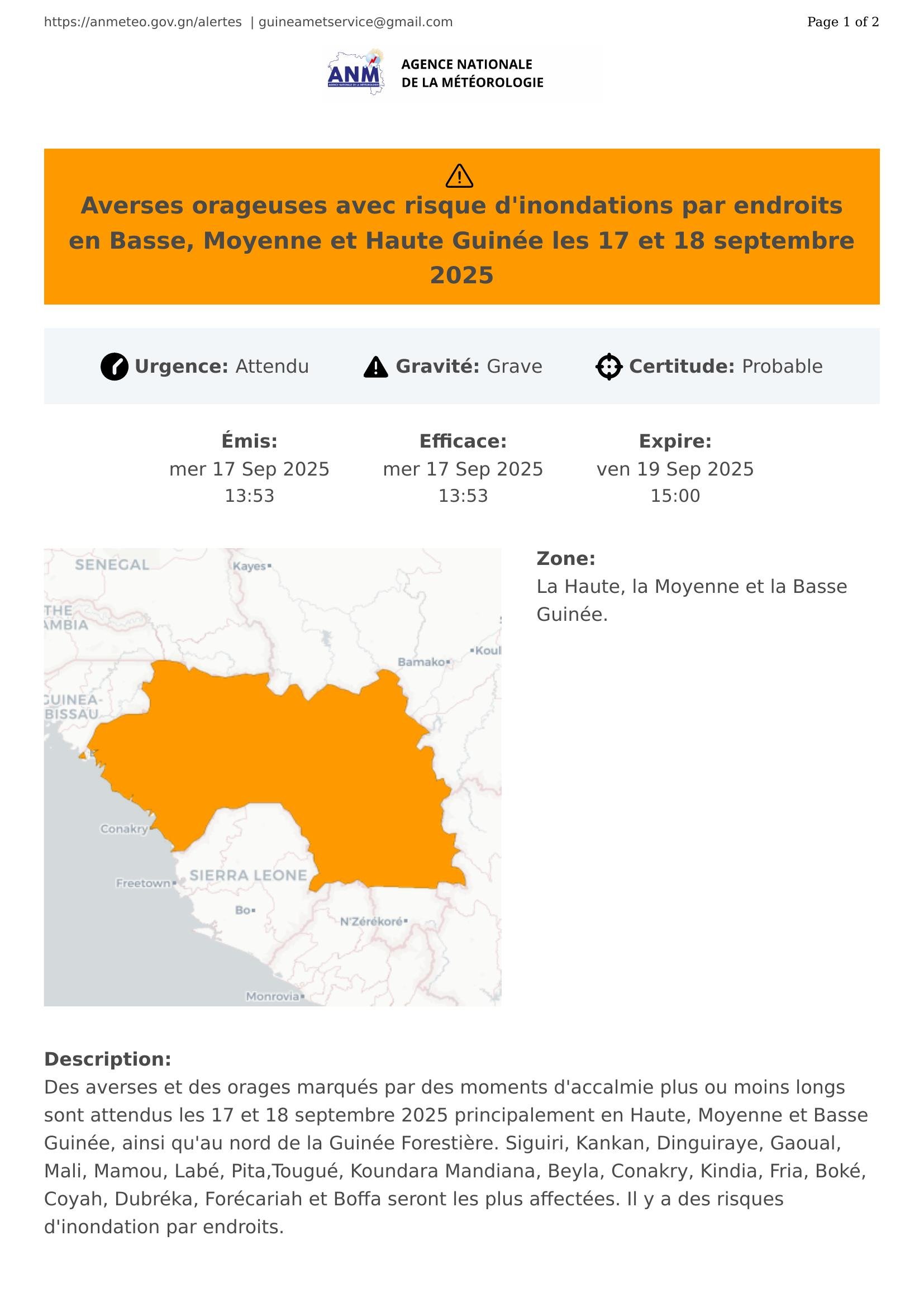 Des averses et des orages marqués par des moments d'accalmie plus ou moins longs sont attendus les 17 et 18 septembre 2025 principalement en Haute, Moyenne et Basse Guinée, ainsi qu'au nord de la Guinée Forestière. Siguiri, Kankan, Dinguiraye, Gaoual, Mali, Mamou, Labé, Pita,Tougué, Koundara Mandiana, Beyla, Conakry, Kindia, Fria, Boké, Coyah, Dubréka, Forécariah et Boffa seront les plus affectées. Il y a des risques d'inondation par endroits.