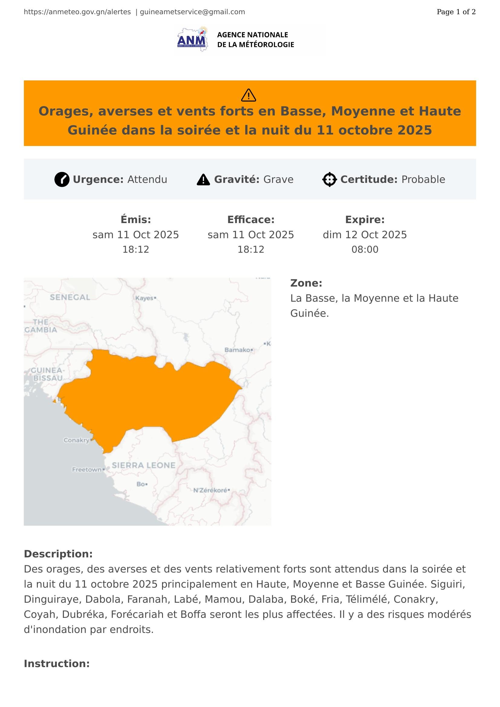 Des orages, des averses et des vents relativement forts sont attendus dans la soirée et la nuit du 11 octobre 2025 principalement en Haute, Moyenne et Basse Guinée. Siguiri, Dinguiraye, Dabola, Faranah, Labé, Mamou, Dalaba, Boké, Fria, Télimélé, Conakry, Coyah, Dubréka, Forécariah et Boffa seront les plus affectées. Il y a des risques modérés d'inondation par endroits.