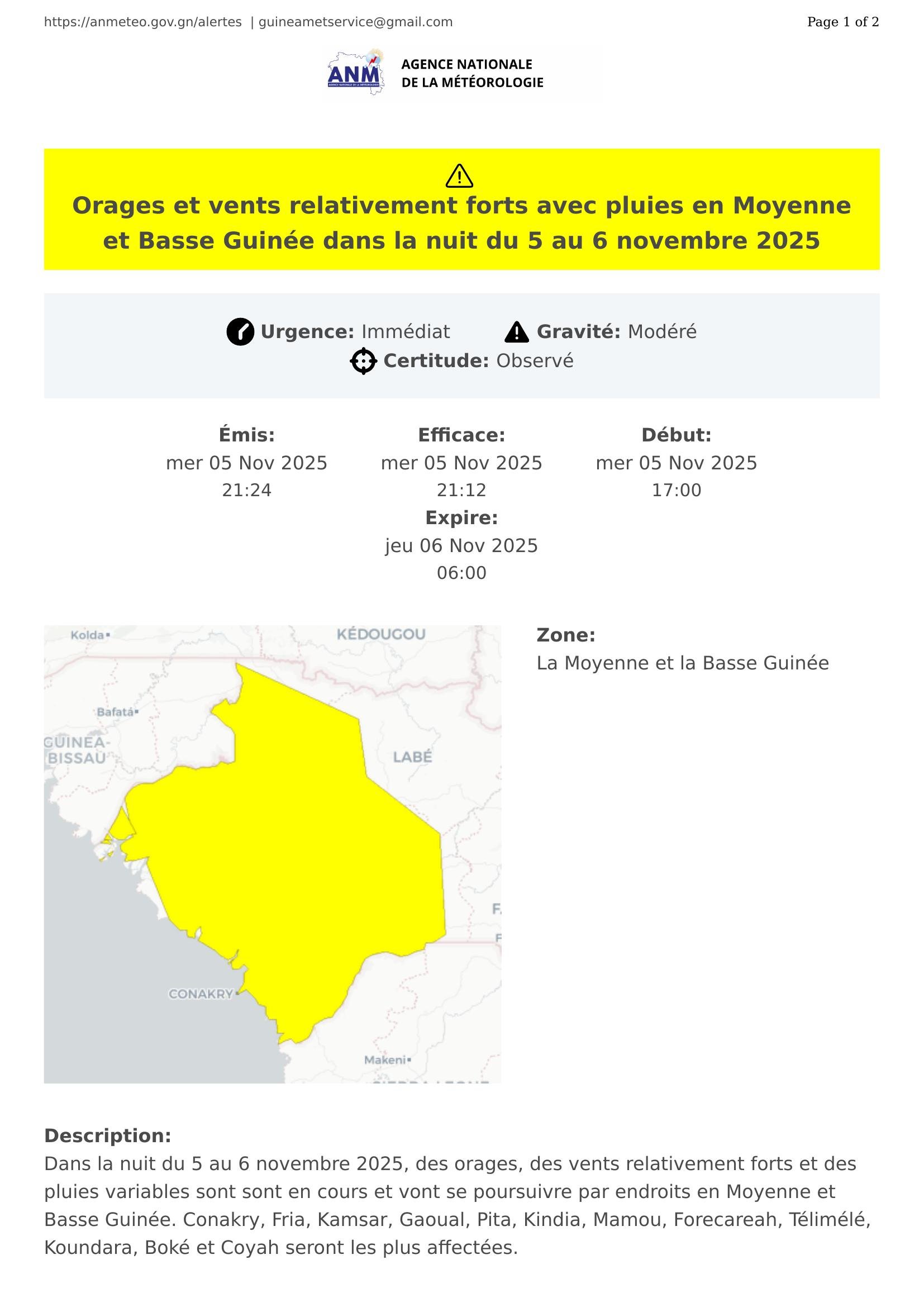 Dans la nuit du 5 au 6 novembre 2025, des orages, des vents relativement forts et des pluies variables sont sont en cours et vont se poursuivre par endroits en Moyenne et Basse Guinée. Conakry, Fria, Kamsar, Gaoual, Pita, Kindia, Mamou, Forecareah, Télimélé, Koundara, Boké et Coyah seront les plus affectées.
