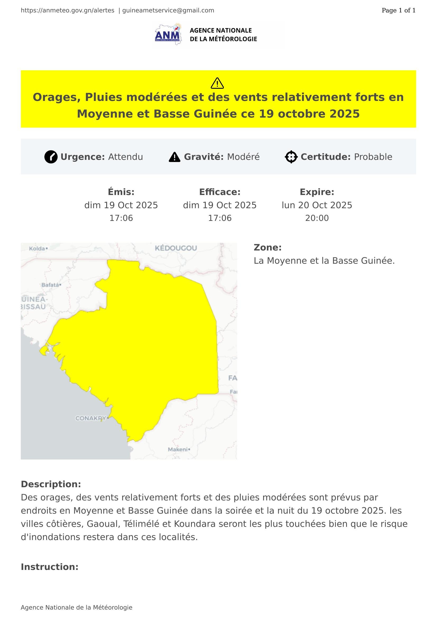 Des orages, des vents relativement forts et des pluies modérées sont prévus par endroits en Moyenne et Basse Guinée dans la soirée et la nuit du 19 octobre 2025. les villes côtières, Gaoual, Télimélé et Koundara seront les plus touchées bien que le risque d'inondations restera dans ces localités.
