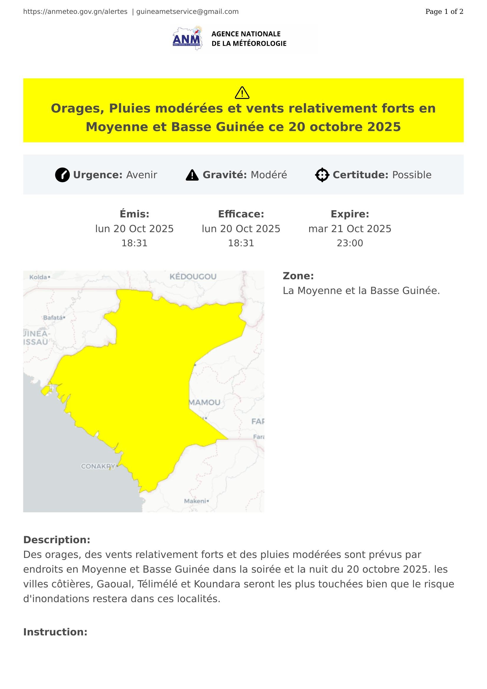 Des orages, des vents relativement forts et des pluies modérées sont prévus par endroits en Moyenne et Basse Guinée dans la soirée et la nuit du 20 octobre 2025. les villes côtières, Gaoual, Télimélé et Koundara seront les plus touchées bien que le risque d'inondations restera dans ces localités.