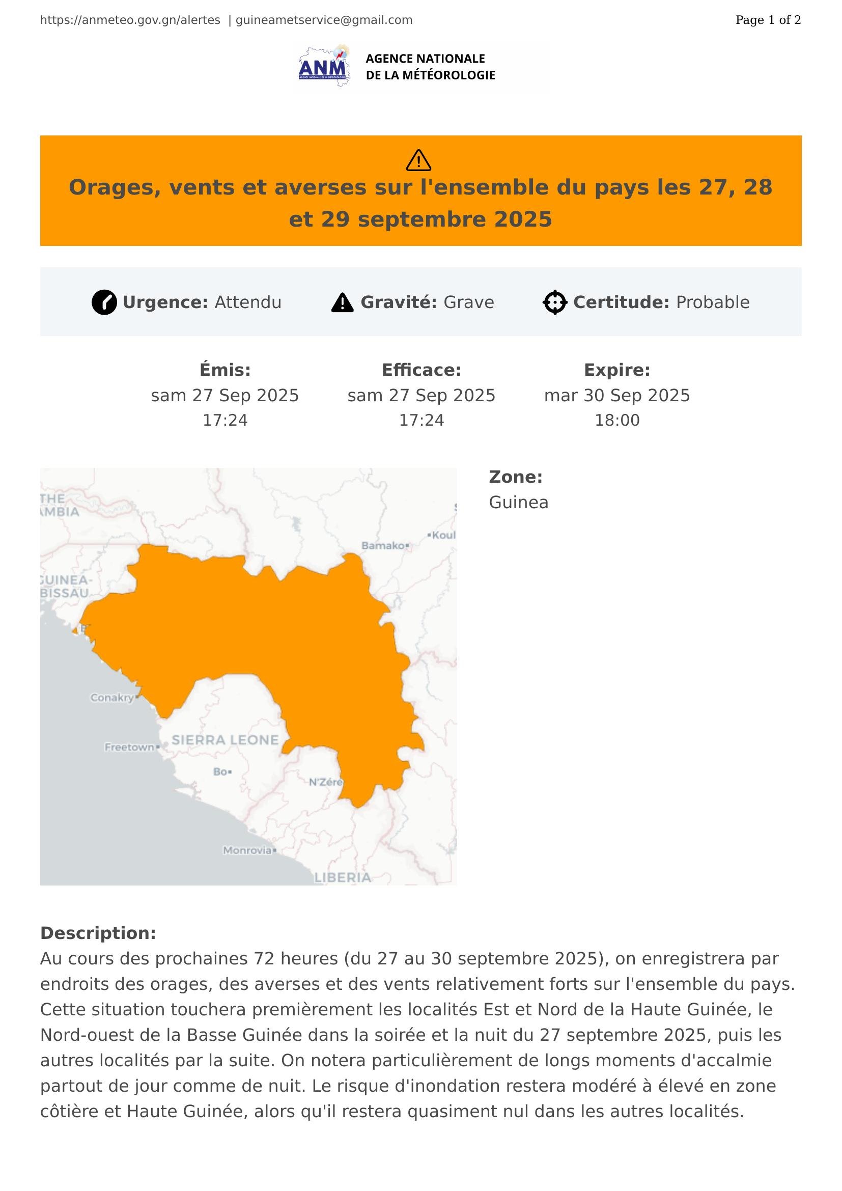 Au cours des prochaines 72 heures (du 27 au 30 septembre 2025), on enregistrera par endroits des orages, des averses et des vents relativement forts sur l'ensemble du pays. Cette situation touchera premièrement les localités Est et Nord de la Haute Guinée, le Nord-ouest de la Basse Guinée dans la soirée et la nuit du 27 septembre 2025, puis les autres localités par la suite. On notera particulièrement de longs moments d'accalmie partout de jour comme de nuit. Le risque d'inondation restera modéré à élevé en zone côtière et Haute Guinée, alors qu'il restera quasiment nul dans les autres localités.