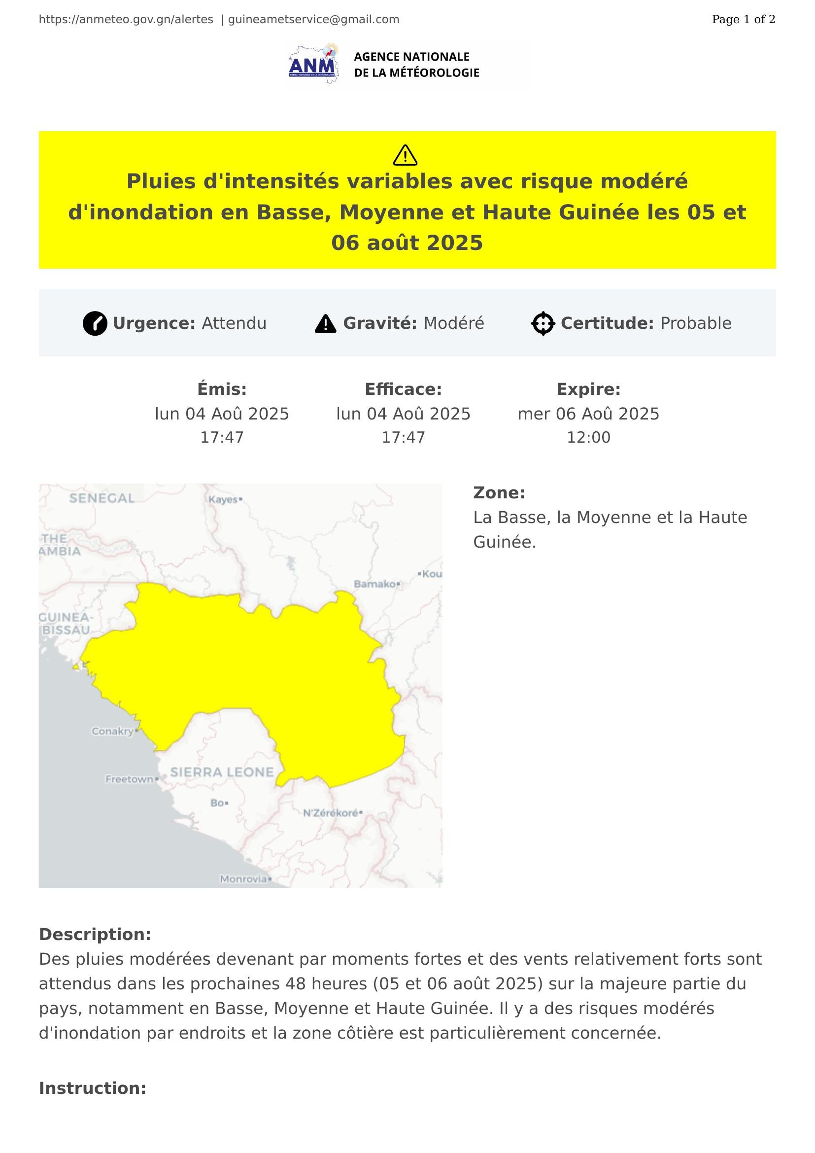 Des pluies modérées devenant par moments fortes et des vents relativement forts sont attendus dans les prochaines 48 heures (05 et 06 août 2025) sur la majeure partie du pays, notamment en Basse, Moyenne et Haute Guinée. Il y a des risques modérés d'inondation par endroits et la zone côtière est particulièrement concernée.