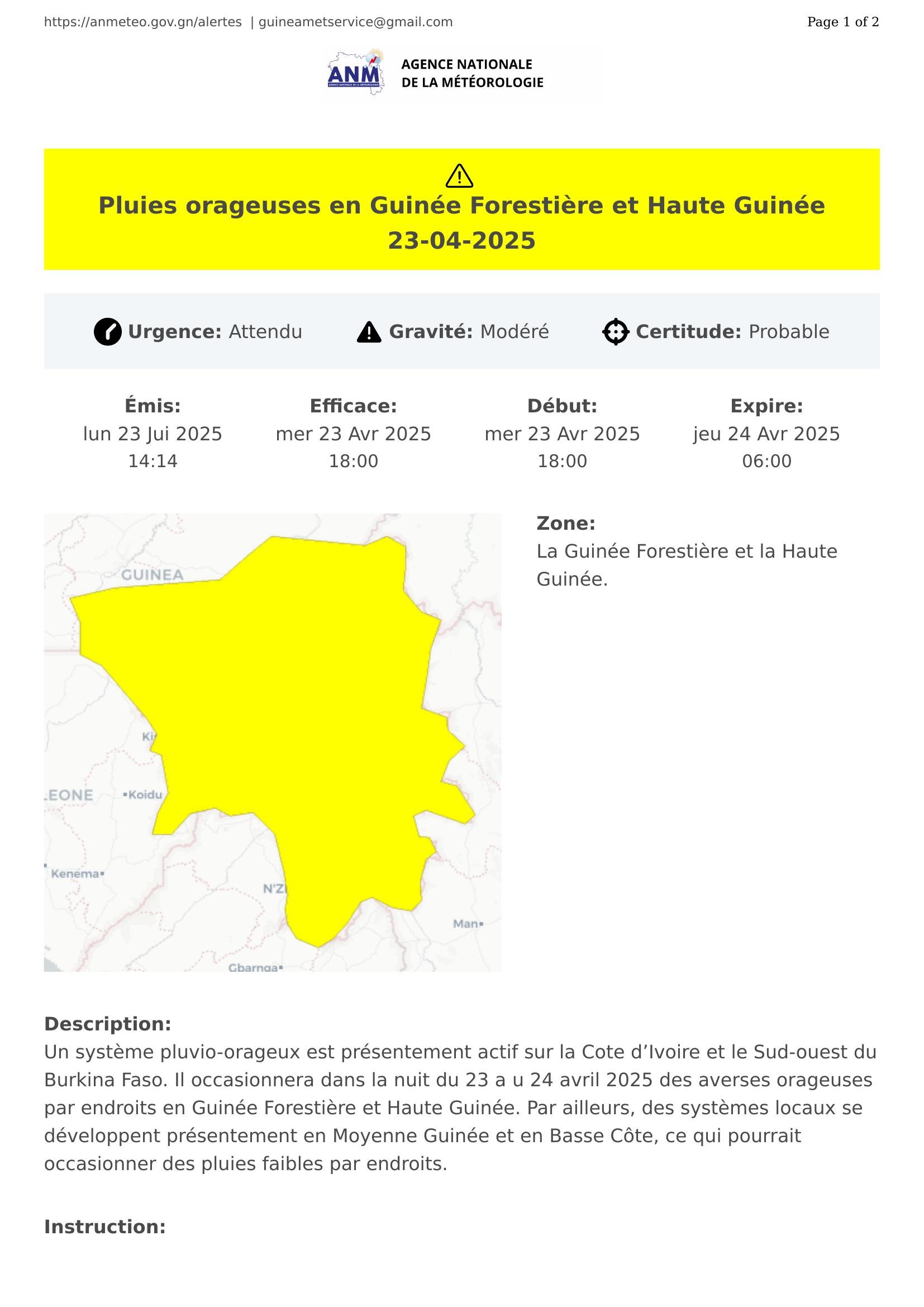 Pluies orageuses en Guinée Forestière et Haute Guinée 23-04-2025