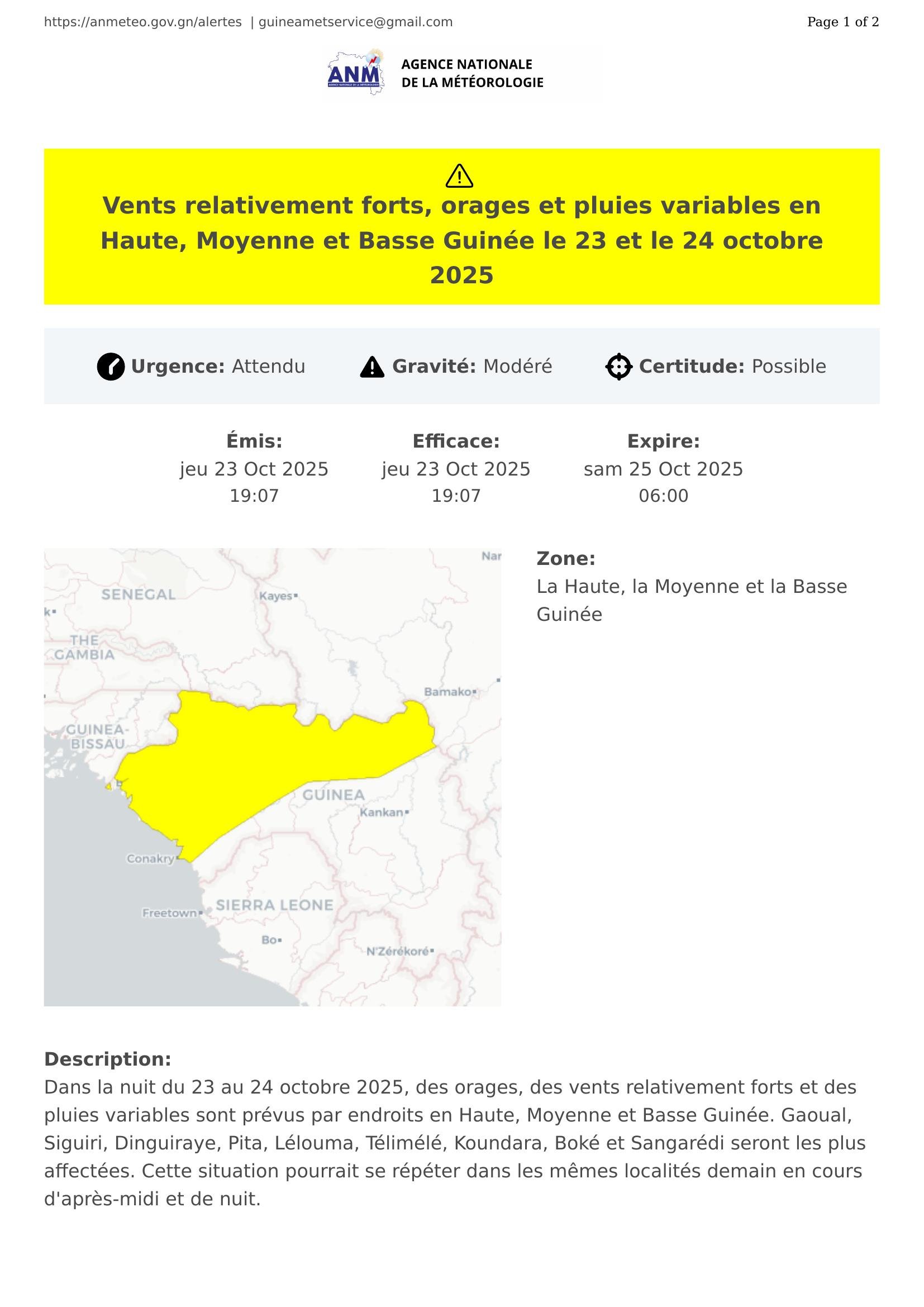 Dans la nuit du 23 au 24 octobre 2025, des orages, des vents relativement forts et des pluies variables sont prévus par endroits en Haute, Moyenne et Basse Guinée. Gaoual, Siguiri, Dinguiraye, Pita, Lélouma, Télimélé, Koundara, Boké et Sangarédi seront les plus affectées. Cette situation pourrait se répéter dans les mêmes localités demain en cours d'après-midi et de nuit.